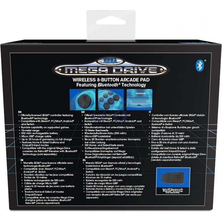 گیم پد retro-bit با طرح دسته سگا مگا درایو، یک گیم پد بیسیم مخصوص بازیهای رترو برای نینتندو سوییچ و کامپیوترهای خانگی است.گیم پد retro-bit Sega Mega Drive با استفاده از بلوتوث و کابل میکرو USB به نینتندو سوییچ و کامپیوتر شما وصل میشود. این گیم پد فاقد گیرنده بلوتوث است و برای اتصال بیسیم آن به کامپیوترهای خانگی باید گیرنده بلوتوث مخصوص آن را تهیه کنید.این گیم پد از نظر ظاهری دقیقا مانند دسته سگا مگا درایو است و دارای شش دکمه اصلی و دو دکمه شانهای است. این گیم پد همچنین دارای دو دکمه Home و Select مخصوص نینتندو سوییچ است و کاملا با تمام بازیهای دو بعدی نینتندو سوییچ و مخصوصا بازیهای کلاسیک سرویس نینتندو آنلاین سازگاری دارد.گیم پد retro-bit دارای یک باتری کارآمد با عمر ۲۰ ساعت با هر بار شارژ کامل است و اگر مدتی از آن استفاده نکنید، به صورت خودکار وارد حالت sleep میشود تا در مصرف باتری صرفهجویی شود. همچنین، این گیم پد دارای دو موتور لرزاننده کوچک در دو طرف گیم پد است.