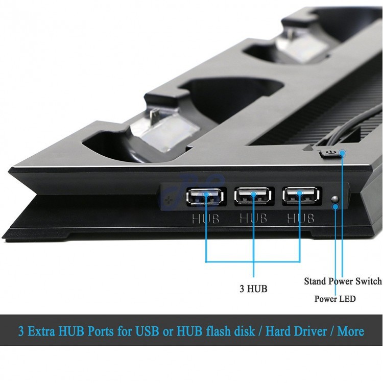 با پایه چندکاره مخصوص پلی استیشن 4 اسلیم، میتوانید کنسول خود را به صورت عمودی قرار دهید، آن را خنک کنید و دو عدد کنترلر دوال شاک ۴ را به صورت همزمان شارژ کنید. این پایه دارای سه عدد پورت USB است تا بتوانید وسایل جانبی خود را از طریق آن به کنسول وصل کنید. ویژگی بارز این پایه، ضخامت بسیار کم آن است.این پایه دارای دو عدد فن قدرتمند و بیصدا است که باعث کاهش دمای درون کنسول شما میشود و ساعتها بدون نگرانی میتوانید بازی کنید. این پایه دارای یک دکمه برای خاموش و روشن کردن فن و یک عدد نشانگر برای نمایش روشن و خاموش بودن فن است.شما میتوانید دو عدد دوال شاک 4 را از طریق پورت مینی USB به این پایه متصل کنید. این پایه،کنترلرهای شما را در کمتر از سه ساعت، کاملا شارژ خواهد کرد.شما میتوانید این پایه را به کنسول یا هر منبع برق دیگری وصل کنید. این پایه فقط با کنسول پلی استیشن 4 اسلیم سازگار است.