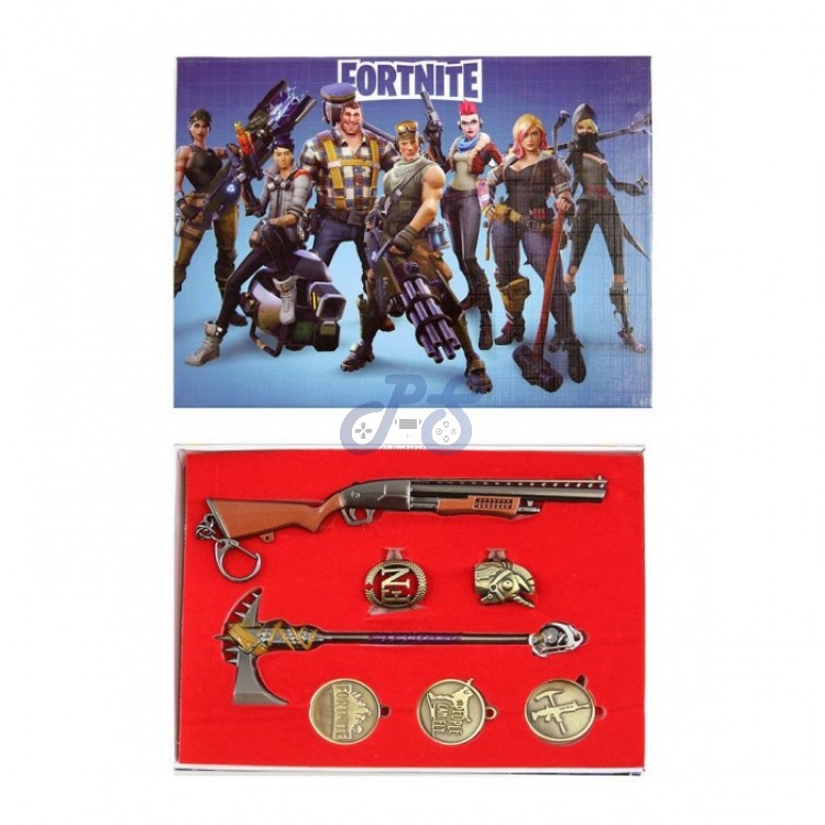 پک لوازم تزئینی با تم بازی Fortnite شامل دو عدد جاکلیدی با طرح رایفل و کلنگ، دو عدد حلقه با طرح بازی و سه عدد آویز با بند و طرح بازی فورتنایت و استودیو People Can Fly است.